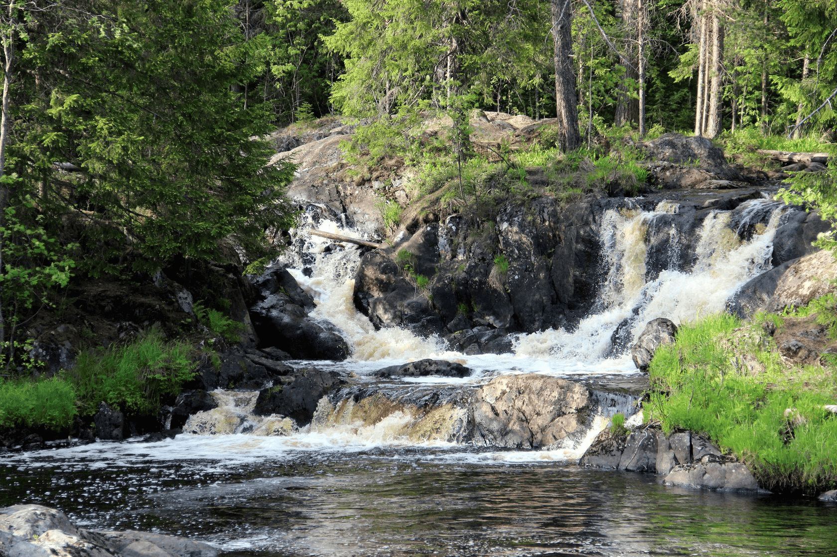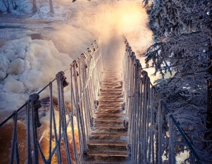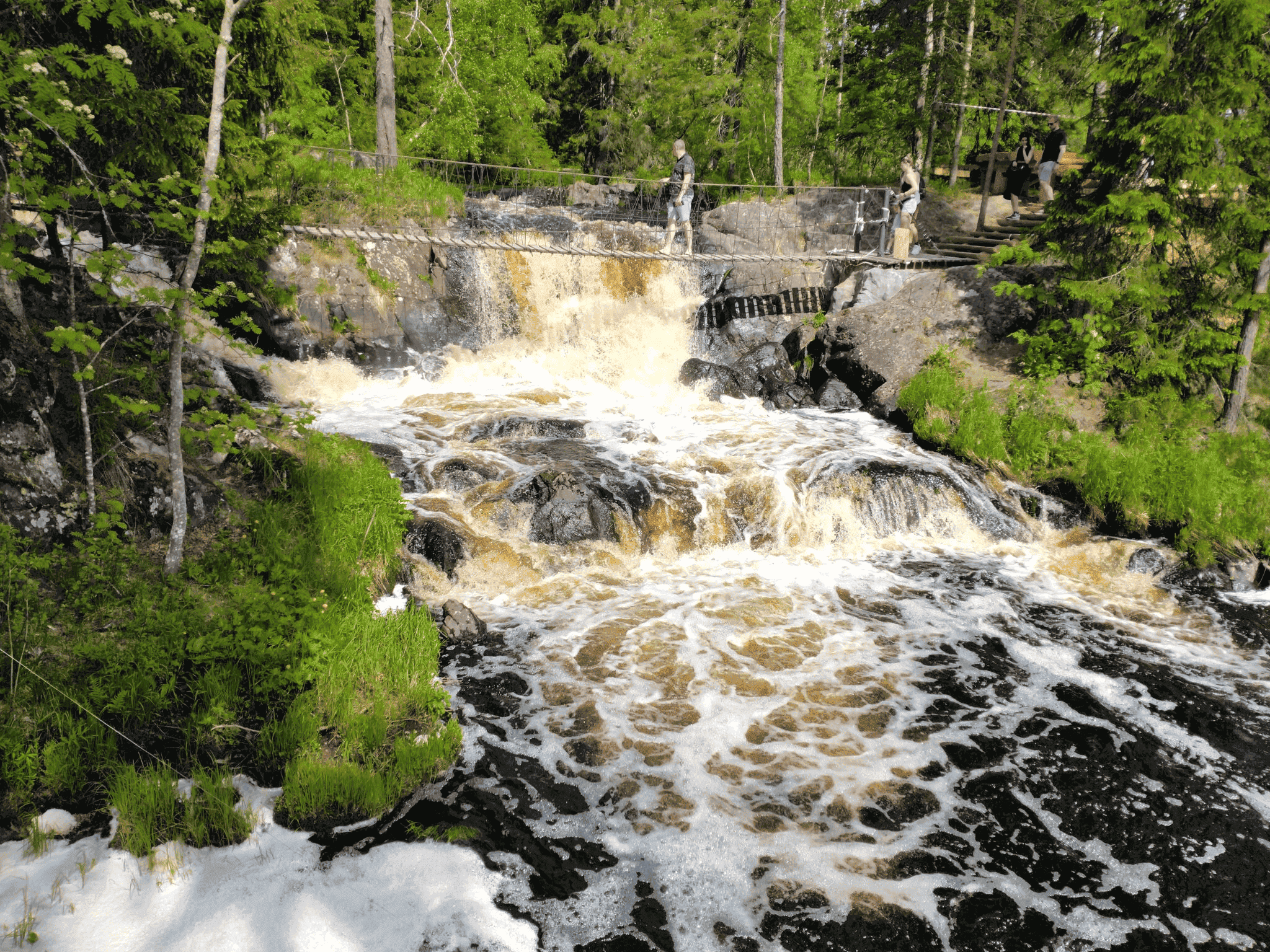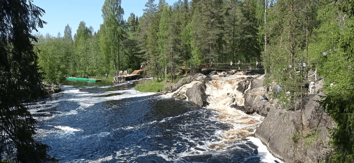 Ахинкоски — это комплекс из четырех равнинных водопадов в месте разлива реки Тохмайоки, расположенный в 5 км от Горного Парка Рускеала. Именно здесь, среди великолепной природы, были сняты сцены легендарного фильма «А зори здесь тихие». Маршрут включает экологическую тропу с подвесными мостами, проходящими прямо над водопадами.
